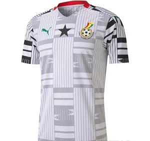 The Puma Ghana 2020-21 home shirt introduces a design featuring the same graphic as the away, the Puma logo is green and the back collar red.