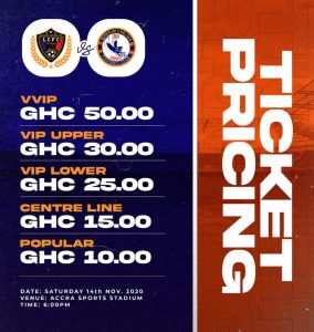 Legon are charging GH¢ 10 for the popular stand and centre line Gh¢15, with lower VIP for Ghc 25, GH¢30 for upper VIP and GH¢50 for VVIP.