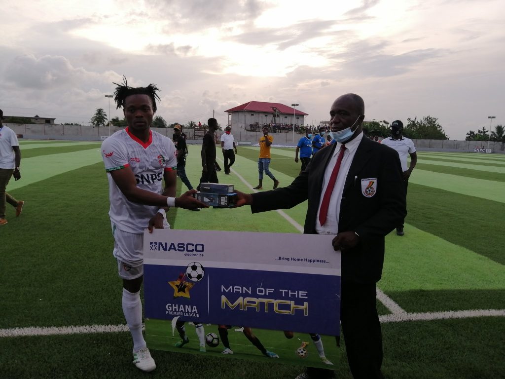 The young defender went home with a brand new smartphone plus a shaving clipper from NASCO Ghana for wining Player of the match In week Two clash between Karela United and Inter Allies.