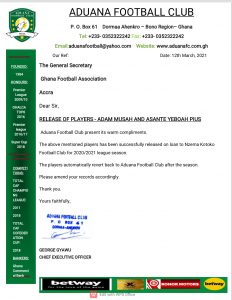 Aduana Stars have officially released two players to Nzema-based Division One League side Nzema Kotoko ahead of the remaining fixtures. The players are Adam Musah and Pius Yeboah Asante.