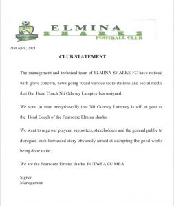 Ghana Premier League side Elmina Sharks insist Coach Nii Odartey Lamptey is still at post, contrary to reports indicating he has left his duties.
