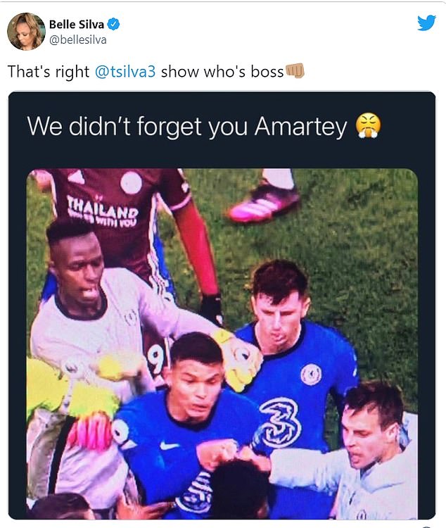 Thiago Silva’s wife, Isabele, has waded into the row between the Chelsea players and Daniel Amartey, backing her husband for ‘showing him who’s boss’.