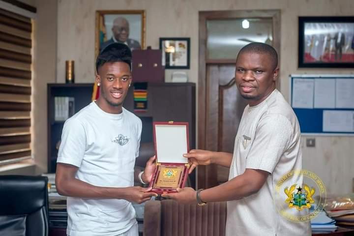 The Minister for Youth and Sports, Hon Mustapha Ussif received Ghanaian born Chelsea footballer, Callum Hudson-Odoi in his office following the player’s visit to H.E Nana Addo Dankwa Akufo Addo.
