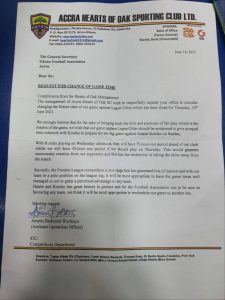 Accra Hearts of Oak have officially requested for the postponement of their league game against Legon Cities which has been fixed for Thursday, 24th June 2021.