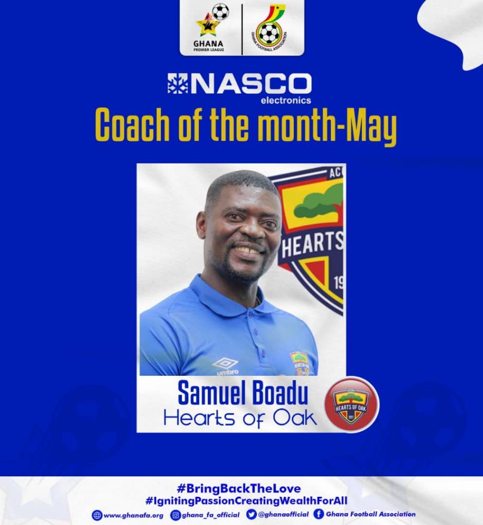 Accra Hearts of Oak coach Samuel Boadu has been named coach of the month for May after leading the club to a perfect May.