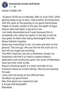 There are several tributes pouring in for the departed soul of Former member of Passionate Karela United Supporter Patrick Kwasi Kojochie a.k.a Bekoa Tuab3.