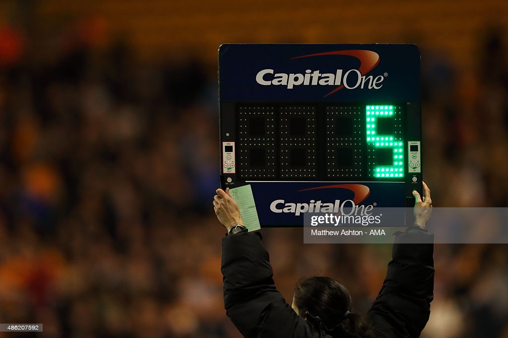 WOLVERHAMPTON, ENGLAND - AUGUST 25: Board showing 5 minutes of added time during the Capital One Cup match between Wolverhampton Wanderers and Barnet at Molineux on August 25, 2015 in Wolverhampton, England. (Photo by Matthew Ashton - AMA/Getty Images)