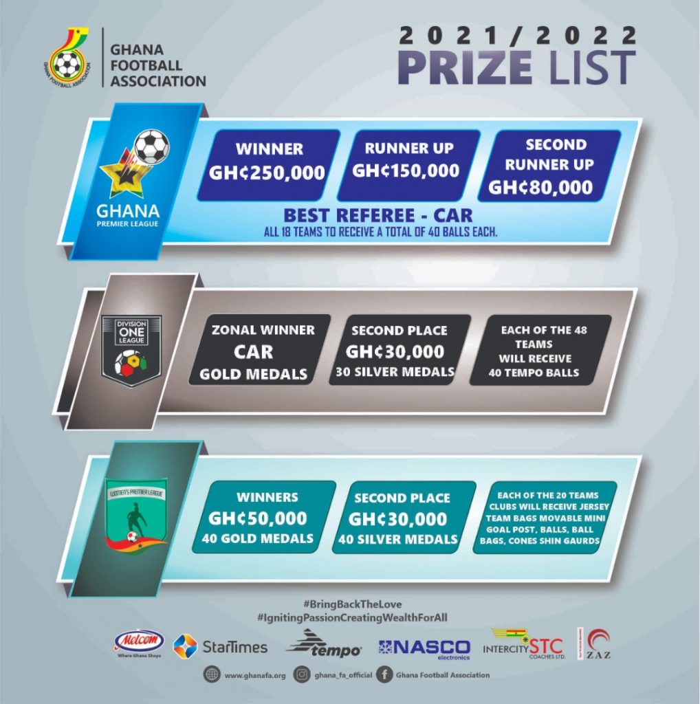 The League winner will take home a trophy and cash prize of GHC 250,000 and 40 gold medals whiles the 1st and 2nd Runner up receive GHC 150,000, 40 silver medals and GHC 80,000, 40 Bronze medals respectively.