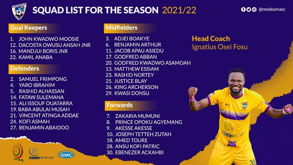 Announcing the registered players and squad numbers given to the every player, Medeama Sporting Club has confirmed that Patrick Akese Akese will wear the Number 9 jersey.