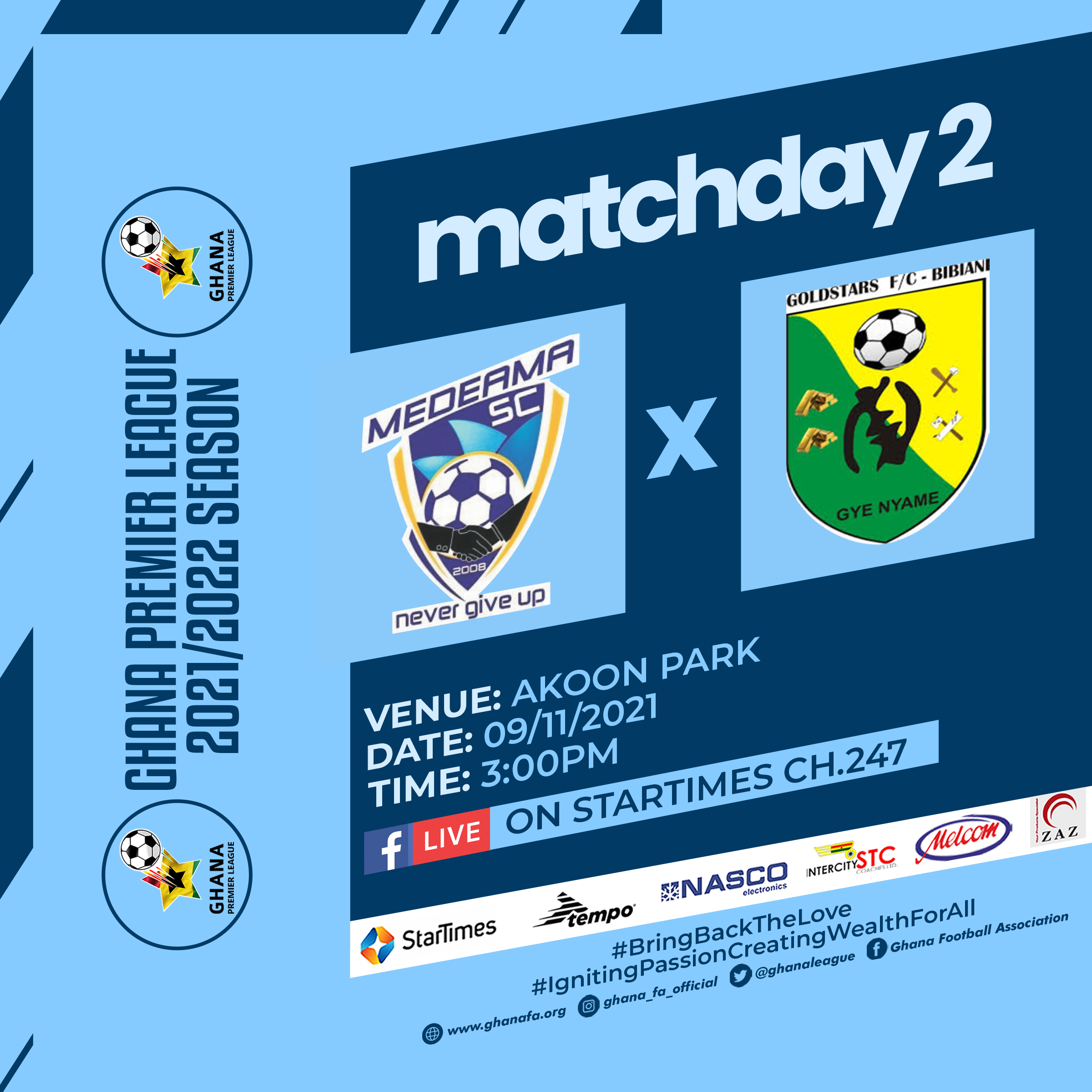 The outstanding Ghana Premier League Matchday 2 tie between Medeama SC and Bibiani Goldstars will be played at the Akoon Park on Tuesday November 9, 2021.