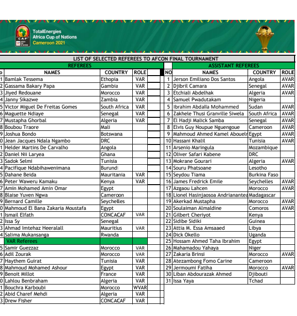 The Confederation of African Football (Caf) has released a list of 64 match officials to take charge of the games at the 2021 Africa Cup of Nations.
