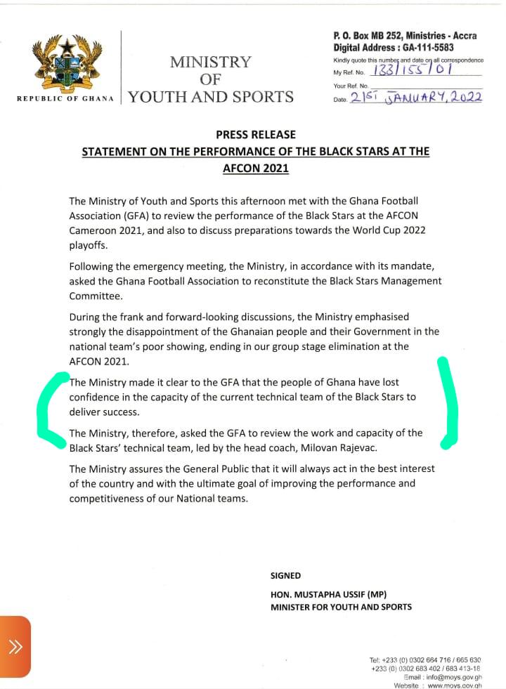 The Ghana FA has been directed to terminate the appointment of Milovan Rajevac with immediate effect.
