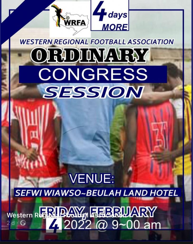 The Western Regional Football Association (WRFA) will hold an Extra-Ordinary Congress on Friday 4 February 2022 at the Buelah Land Hotel in Sewfi Wiawso.