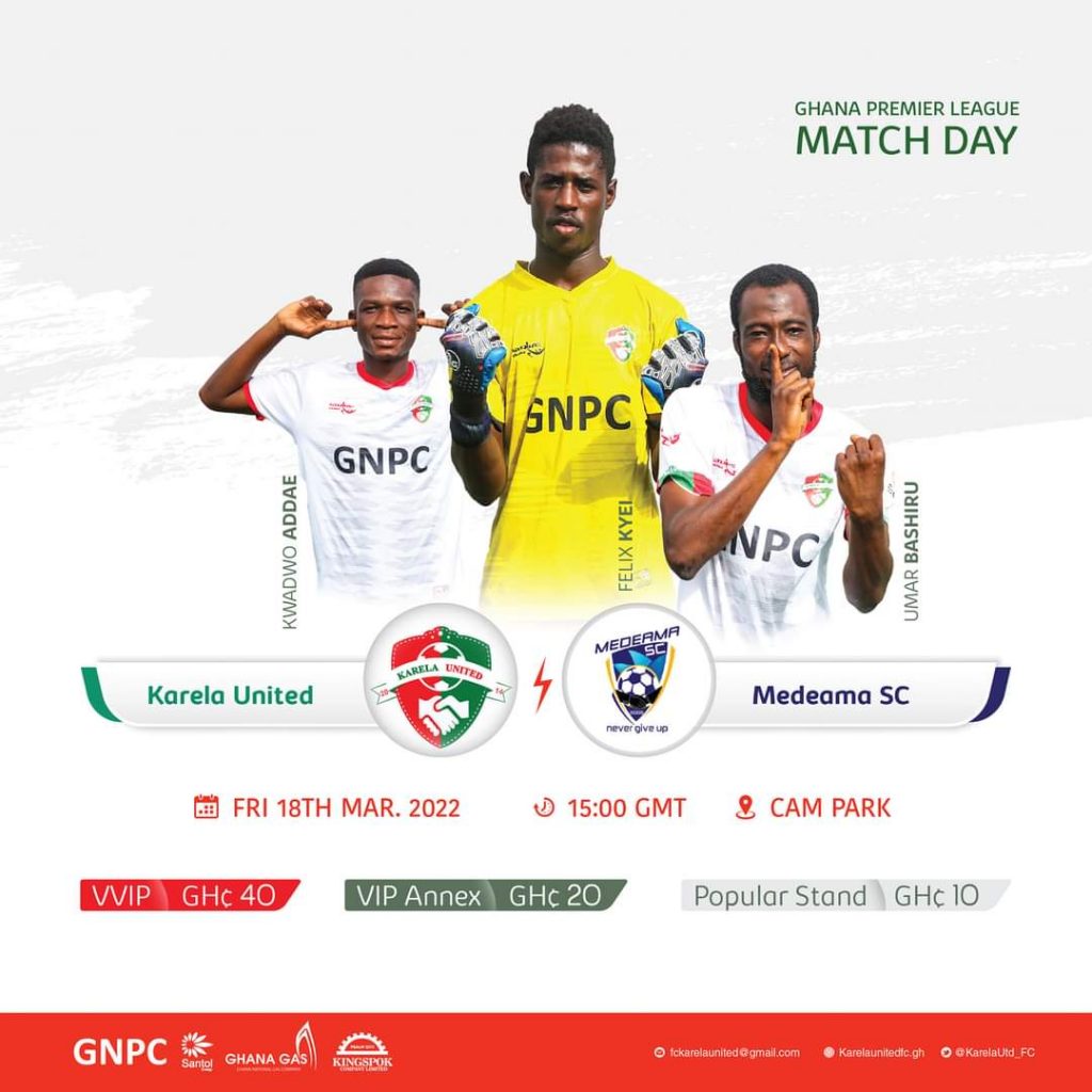 Karela United Football Club will battle old foe Medeama SC on Match Day 21 of the Ghana Premier League at Crosby Awuah Memorial Park on Friday, March 18, 2022.