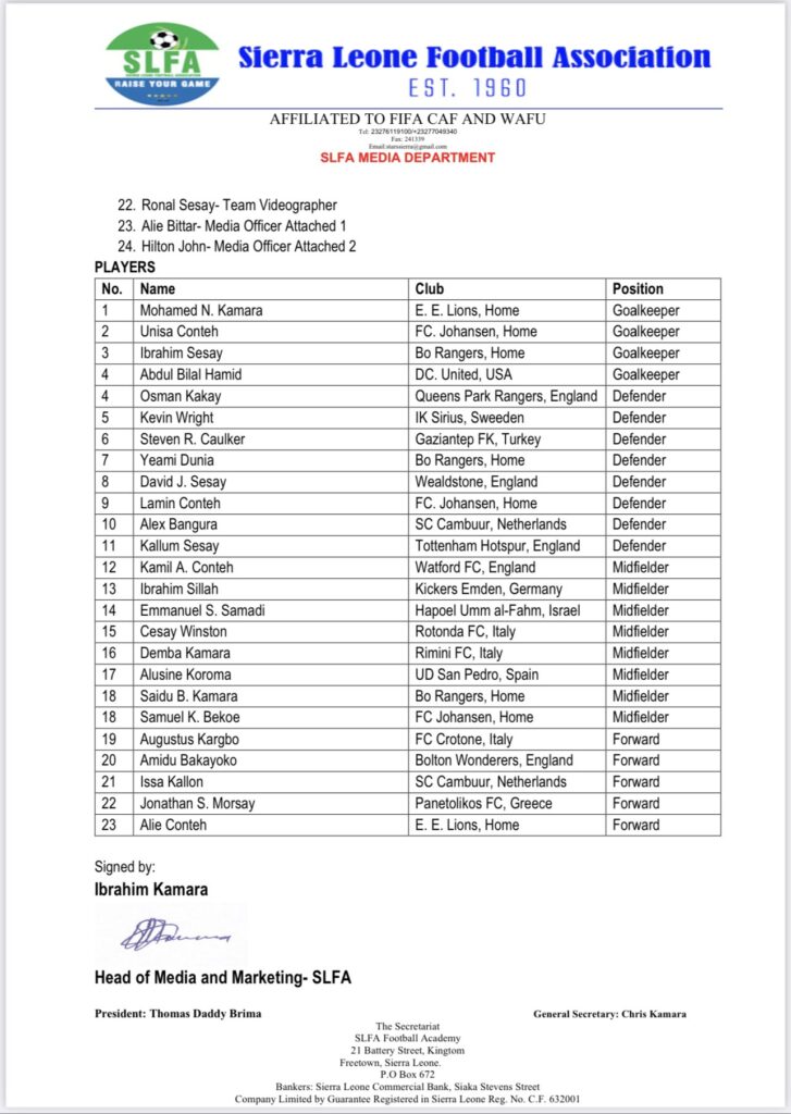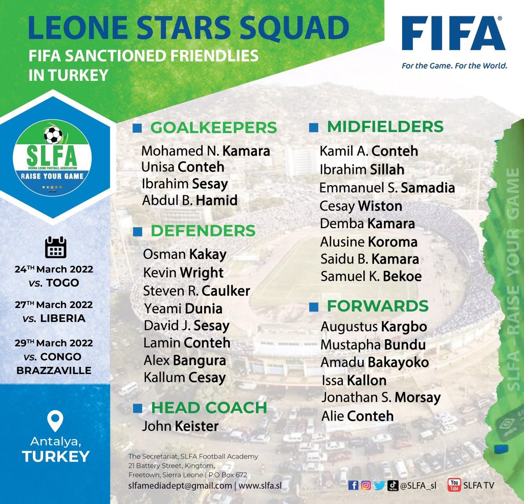 He will now be looking to make his debut when the Leone Stars face Togo on March 24, Liberia three days after before engaging Congo on March 29 in Antalya, Turkey.