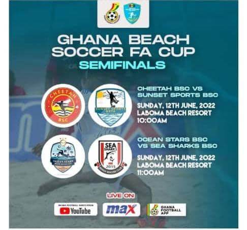 The 2022 Beach Soccer Fa cup has reached the semi final Stage with the debutants Cheetah BSC, Hot shorts sunset from Keta, high flying Ocean Stars and the dreaded Sea Sharks progressing.