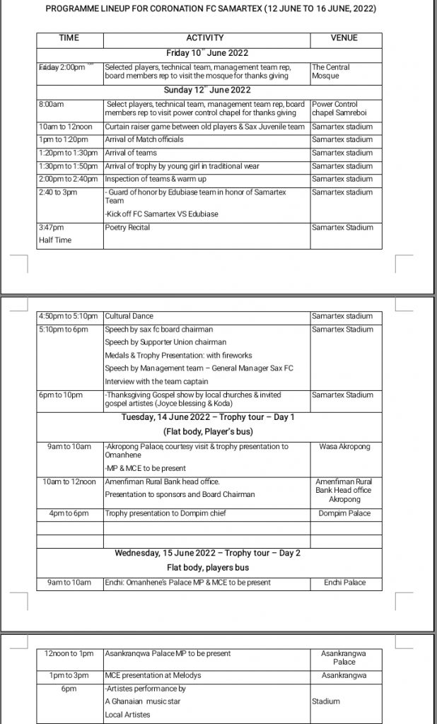 The board and management of Samartex FC have confirmed the program line-up for their historic qualification and coronation match against New Edubiase.