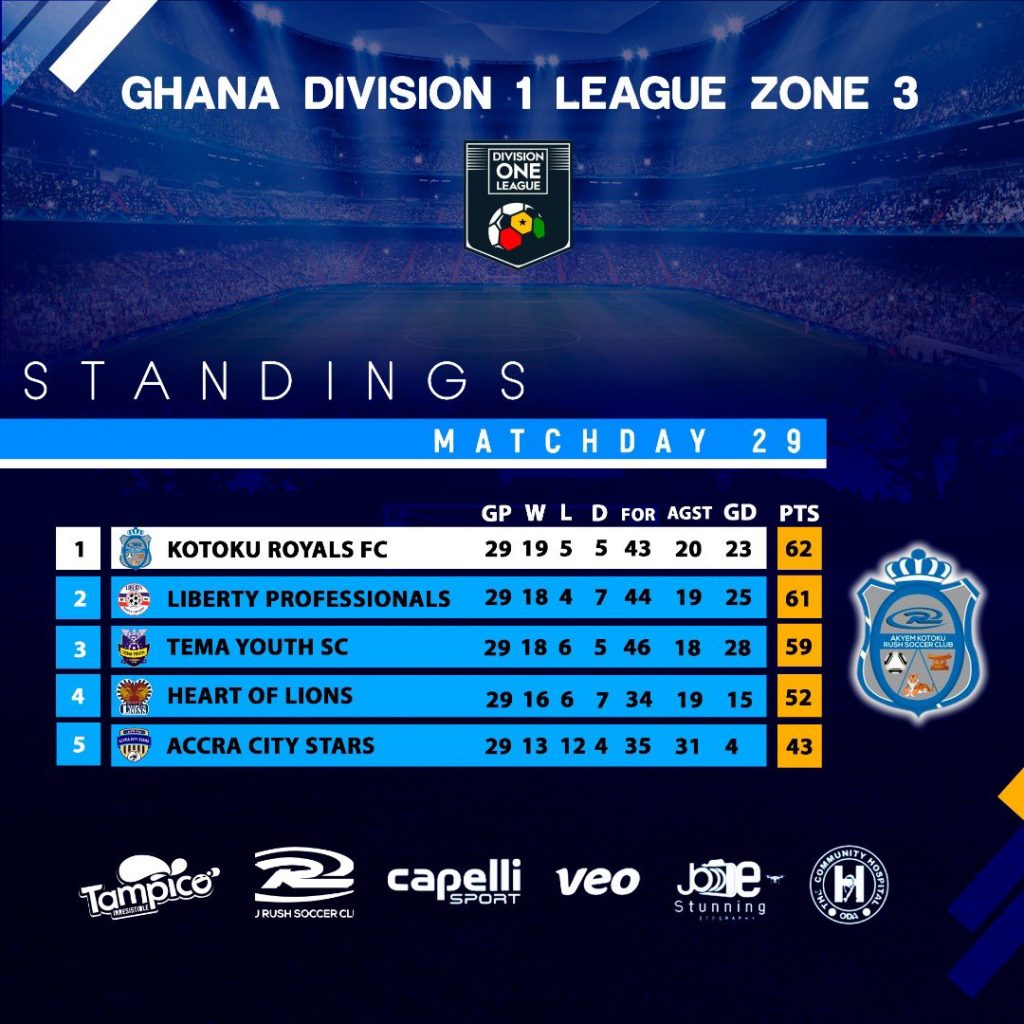 League leaders Kotoku Royals will play Tema Youth for the chance to make it to the Ghana’s top-flight for the first time in 19 years.