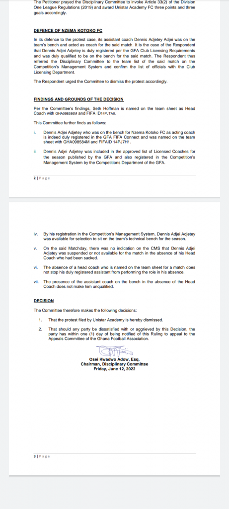 The GFA Disciplinary Committee has dismissed Unistar Academy’s protest againts Nzema Kotoko in relation to their Division One League Matchday 26 game.