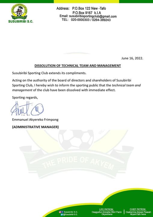 “Acting on the authority of the board of directors and shareholders of Susubribi Sporting Club, I hereby wish to inform the sporting public that the technical team and management of the club have been dissolved with immediate effect” the statement reads.