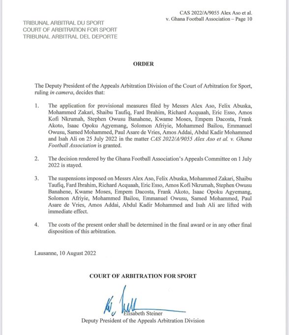 However, the ban is yet to have a permanent ruling since the main case is yet to be determined; GFA General Secretary Prosper Harrison Addo has reportedly stated CAS’ temporal ruling was to aid the players to not miss out on registration to compete in the upcoming season.