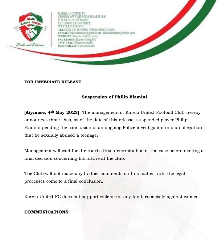 Karela United have suspended Philip Flamini pending an investigation and final court decision after the midfielder was charged by court with defilement and sexual assault.