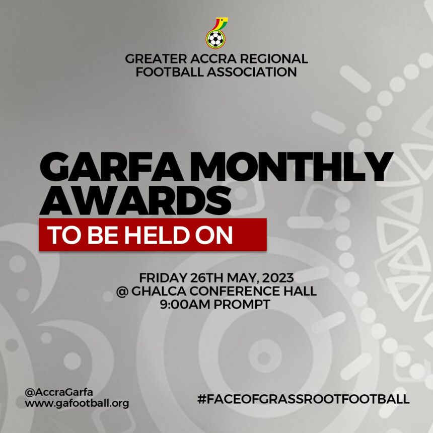 The Greater Accra Regional Football Association( GARFA)will hold its third edition of the GARFA Monthly Awards for April at the GHALCA Conference Hall Media at the Accra Sports Stadium on May 26, 2023 at 9am.