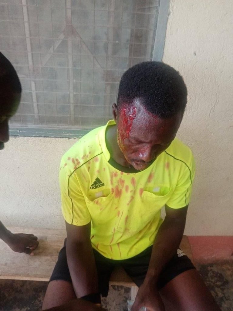 Things turned ugly immediately after referee Patrick Adjei Sarpong had blown his whistle, saw an enraged reaction from one player identified by the name Joseph Oteng Adjei attacked the referee and hit him with a metal and punches in his face.