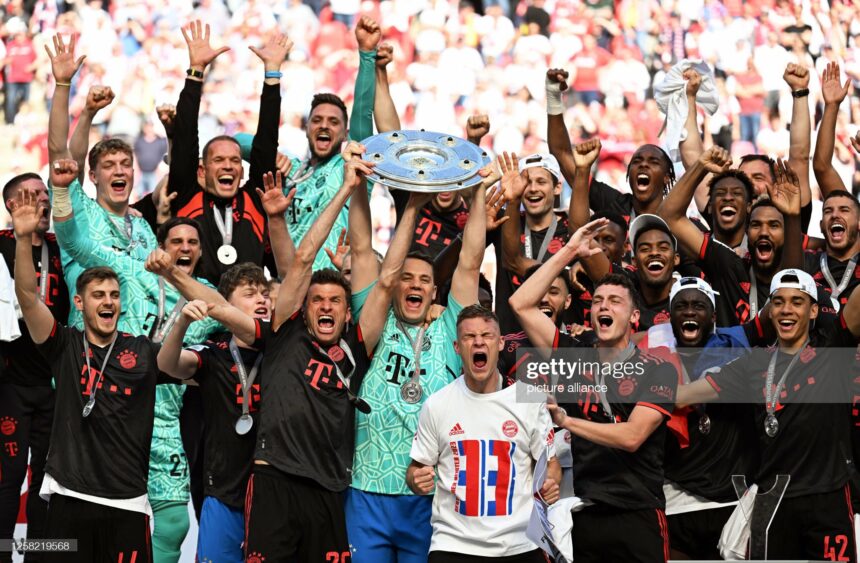 27 May 2023, North Rhine-Westphalia, Cologne: Soccer: Bundesliga, 1st FC Cologne - Bayern Munich, Matchday 34, RheinEnergieStadion. Bayern goalkeeper Manuel Neuer (center) holds up the championship trophy while his teammates cheer after winning the 33rd German championship. IMPORTANT NOTE: In accordance with the requirements of the DFL Deutsche Fußball Liga and the DFB Deutscher Fußball-Bund, it is prohibited to use or have used photographs taken in the stadium and/or of the match in the form of sequence pictures and/or video-like photo series. Photo: Federico Gambarini/dpa (Photo by Federico Gambarini/picture alliance via Getty Images)