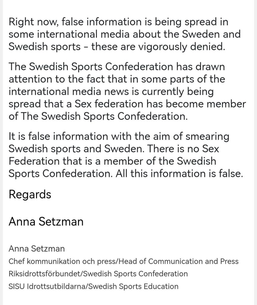 Other mainstream outlets and their social media platforms have also carried the claim. However, the Swedish sports body has denied the existence of any such event.