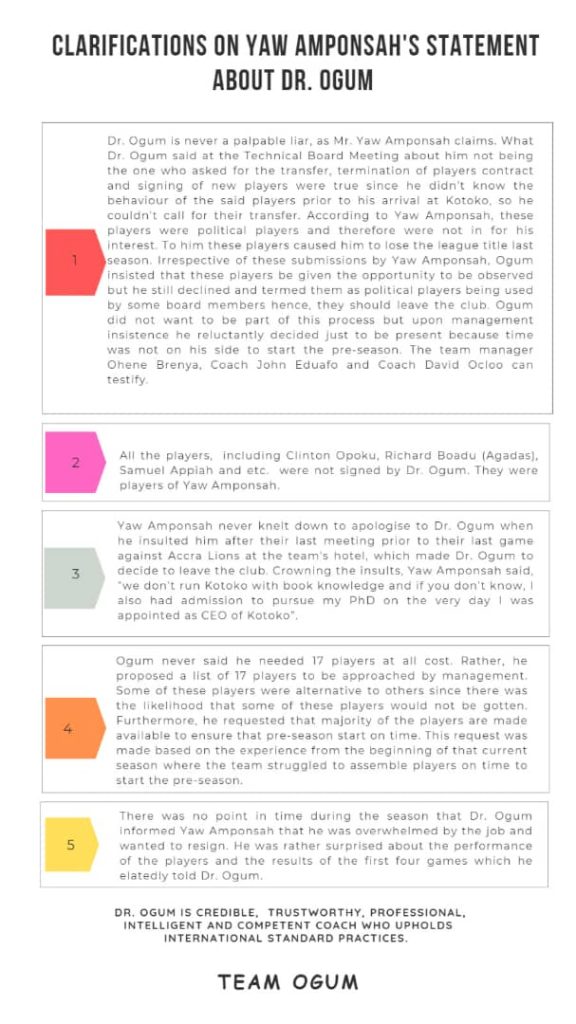 However, with reference to reports and statements made by Asante Kotoko’s Chief Executive officer, Nana Yaw Amponsah, on their client, Prosper Nartey Ogum, “Team Ogum “has officially released press statement to clarify widely circulated misinformation made by the astute football administrator.