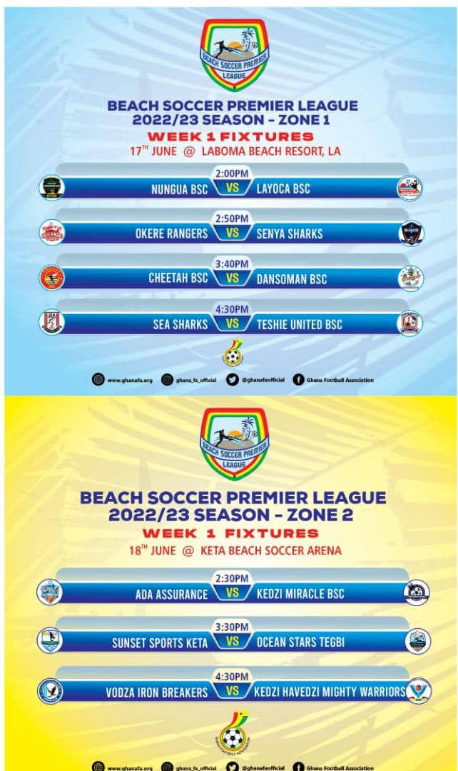 In zone 2, three-time winners and defending Champions, Sunset sports keta will host Ocean stars Tegbi at the Keta Beach Soccer Arena whilst one-time winners, Kedzi Havedzi Mighty Warriors will play against Vooza Iron Breakers.