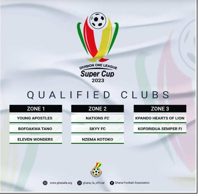 Winners of Zone 1B, Bofoakwa Tano, alongside Young Apostles and Eleven Wonders will compete from Zone. Whiles Nations FC, former champions Skyy FC and Nzema Kotoko make up the list of clubs from Zone Two with Koforidua Semper FI and Hearts of Lions representing Zone Three.