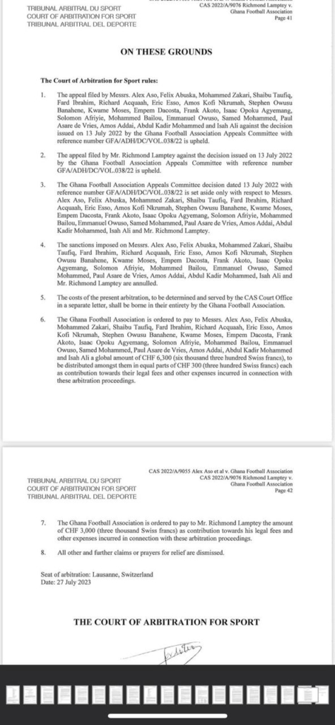 However, the players were allowed to continue playing competitive football after the Professional Football Association of Ghana (PFAG) lodged a complaint on their behalf through the International Federation of Professional Footballers (FIFPro). CAS granted them the benefit of the doubt as they investigated the matter.