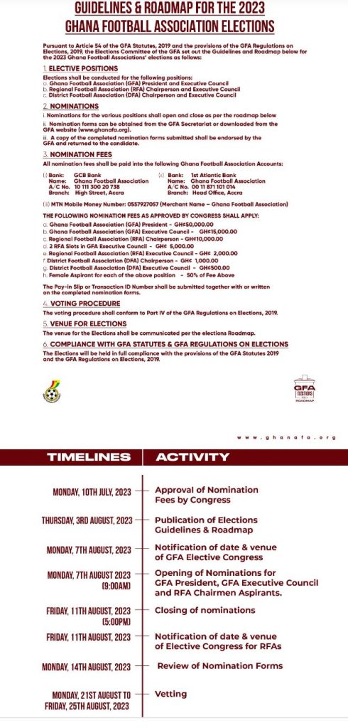 Pursuant to the relevant provisions of the GFA Statutes 2019 and the GFA Regulations on Elections 2019, the Elections Committee of the Ghana Football Association wishes to announce for the attention of the football family and all stakeholders, the Guidelines and Roadmap for the 2023 GFA Elections.