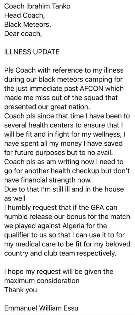 Essu was also left out from the Black Meteors squad during the Afcon U-23 Championship in Algeria due to his current illness.