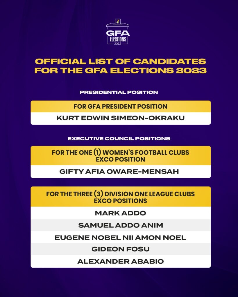 The vice chairman of the FA, Mr. Mark Addo would be on the ballot paper along with Eugene Nobel Nii Amon Noel, Gideon Fosu and Alexandra Ababio respectively for the Division One League Exco positions.