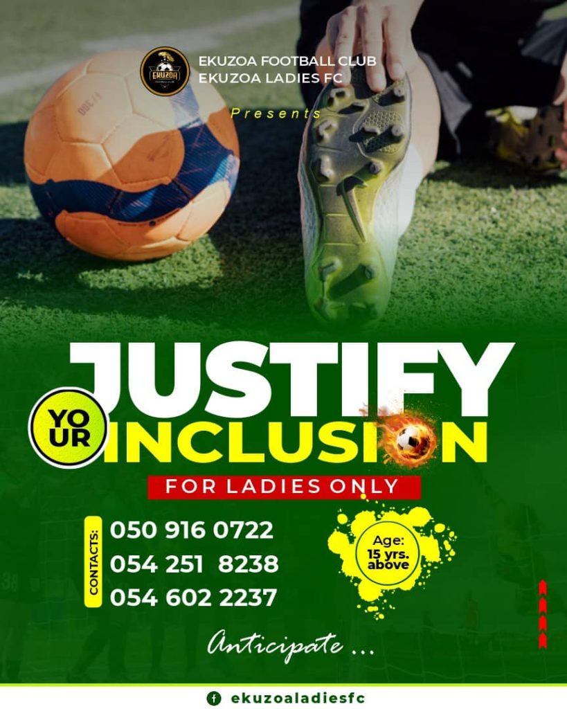 Newly formed Ekuzoa Ladies Football Club wish to announce to the general public that, the club will be organizing a justify-your-inclusion-exercise as part of it’s recruiting process.