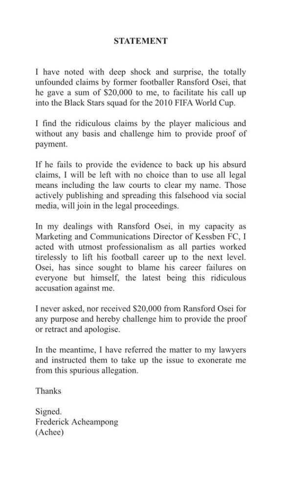 Acheampong communicated this in an official statement released in response to Osei’s claims that he paid Acheampong a sum of $20,000 to aid the former Ghana Under 17 and Under 20 star secure a spot in Ghana’s second ever World Cup campaign.