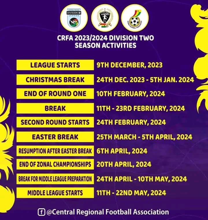The Central Regional Divisio Two League commences on the 9th of December and ends on the 22nd of May 2024.