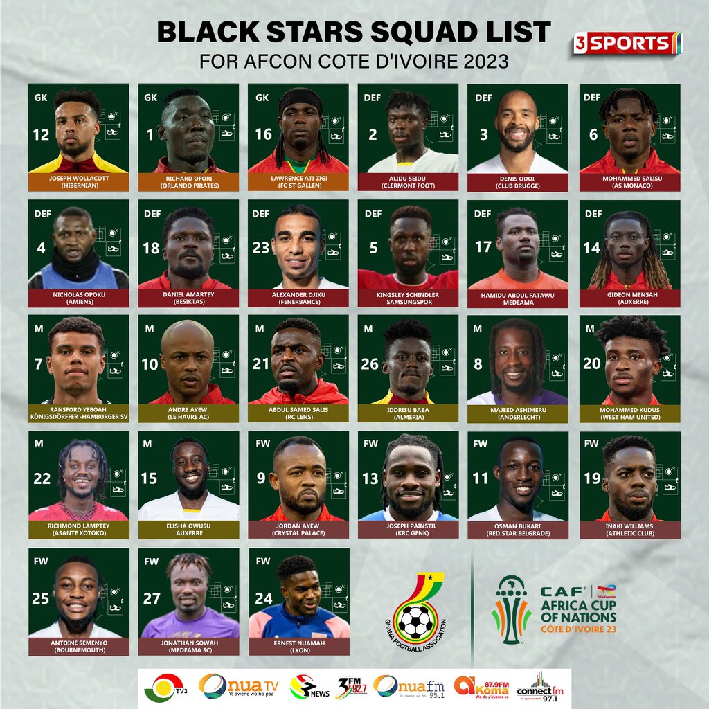 The jersey numbers for Ghana’s 27-man squad for the 2023 Africa Cup Of Nation have been released, with some interesting numbers.