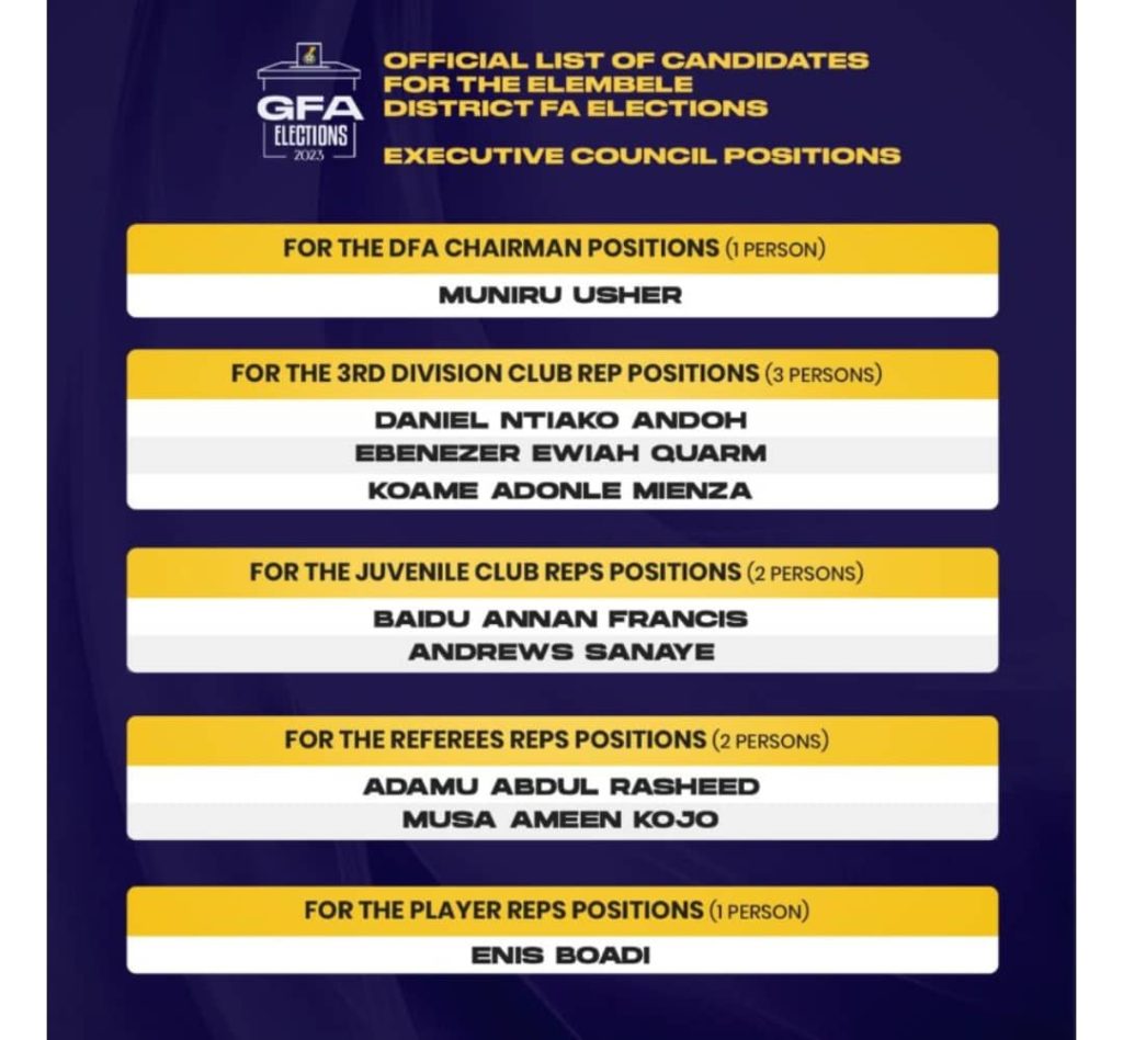 The Western Regional Football Association Elections Committee has announced the official list of candidates for the 2024 Ellembelle District Football Elections.