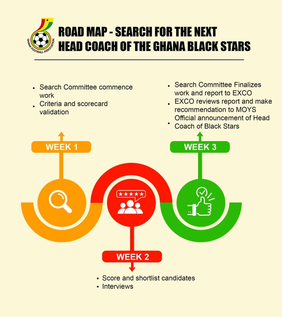 The Ghana Football Association has announced the roadmap to hire the next Black Stars coach and named a five-member search committee to evaluate and recommend a candidate to the Executive Council for approval.