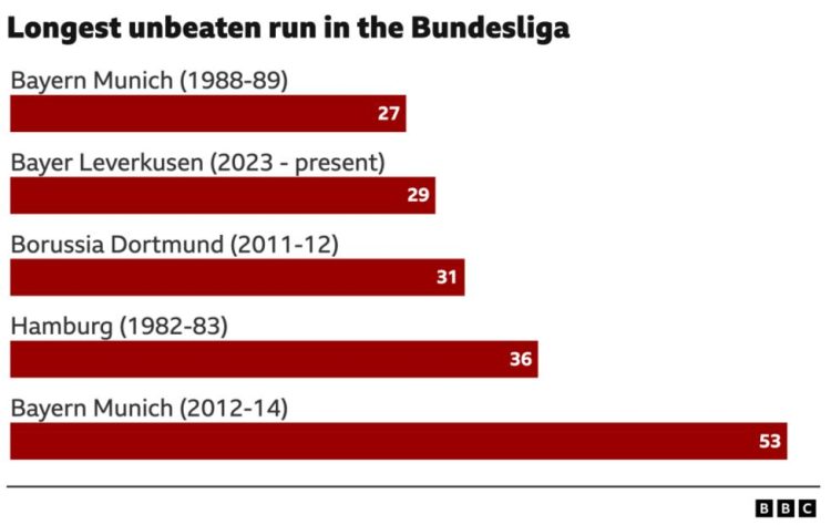 “To go unbeaten in the Bundesliga, ending Bayern Munich’s long reign, it’s really quite unbelievable,” broadcaster and Leverkusen fan David Keppel told BBC World Service Sport.