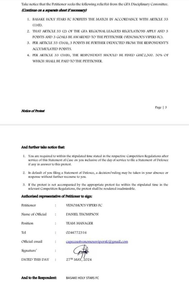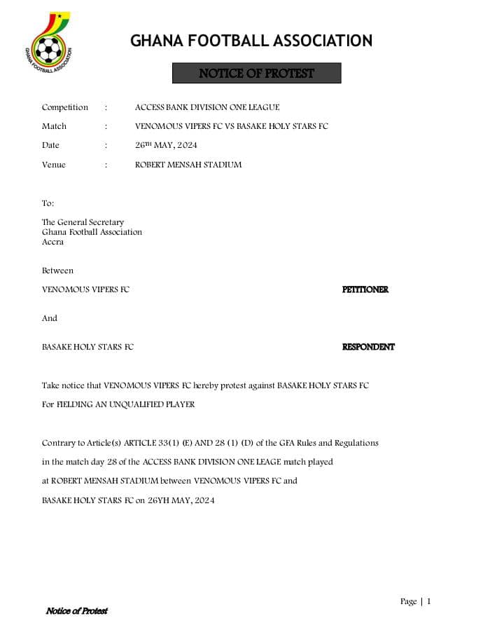 Venomous Vipers supporters have officially verified that the club have filed a protest against Basake Holy Stars for fielding an unqualified player.