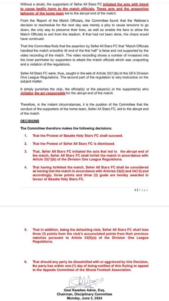 The Ghana Football Association Disciplinary Committee has officially awarded Basake Holy Stars 3 points after successful protest filed against Sefwi All Stars for causing an abrupt end during matchday 27 clash at the Sefwi Ramos Park.