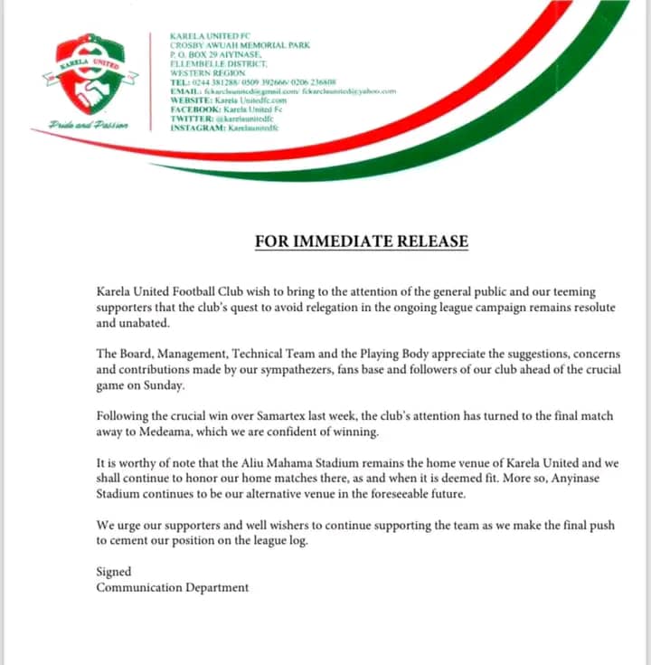 Karela United on Wednesday issued an emotional message to their teeming supporters ahead of their crucial game against Medeama SC.