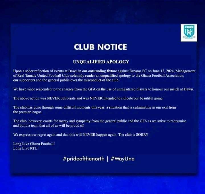 Real Tamale United has officially issued an unqualified apology to the Ghana Football Association, begging for “mercy” for fielding unregistered players against Dreams FC on Wednesday, June 12, 2024.