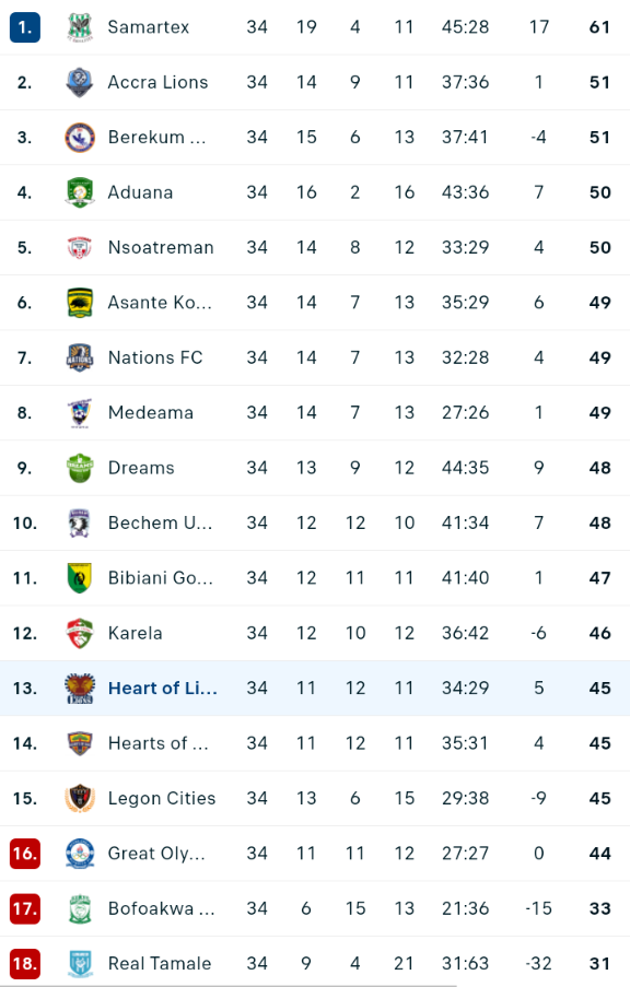 Berekum Chelsea’s 2-2 draw with Kpando Heart of Lions denied them second place and had to settle for third place tied on 51 points with Accra Lions but with an inferior goal difference.