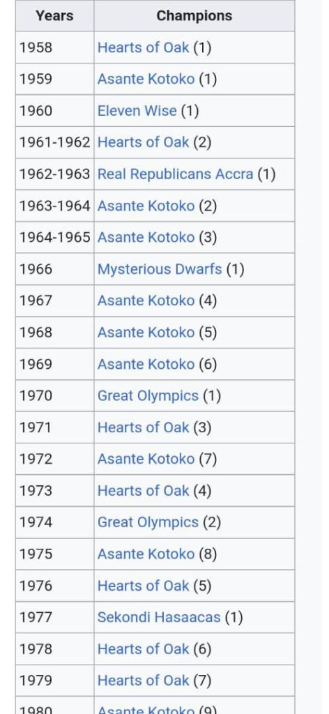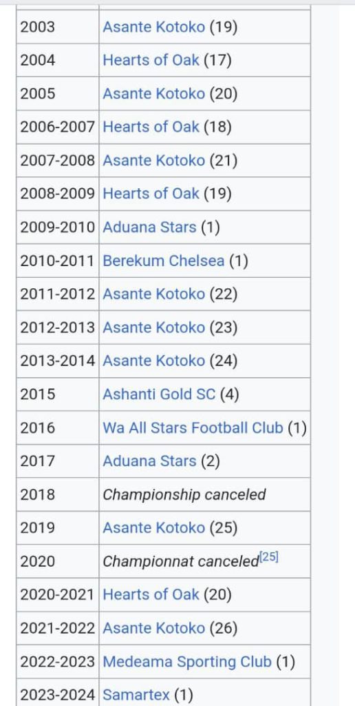 The Previous Ghana League winners have been Asante Kotoko, Hearts of Oak, AshantiGold, Accra Great Olympics, Real Republicans, Eleven Wise, Ebusua Dwarfs, Hasacaas, Aduana Stars, Berekum Chelsea, Wa All Stars, Medeama SC and Samartex.